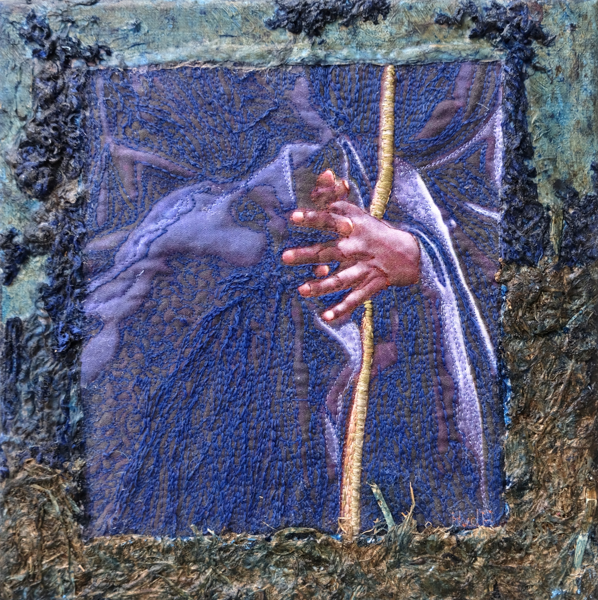 Handen van een herder in Ethiopie, die uitrust. Hij houdt zijn stok vast terwijl hij zit. Op textiel. Stikwerk met wol. Gedroogde wortels op de randen.