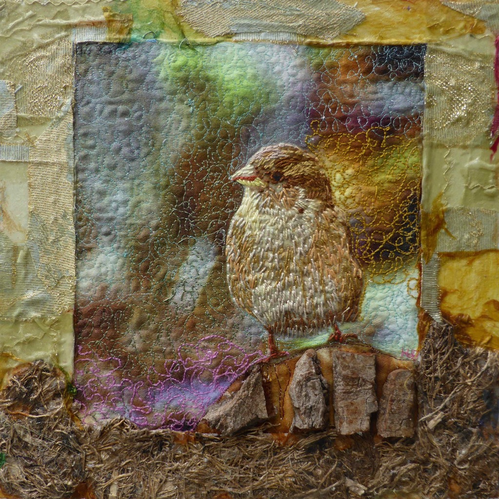 Een vogeltje kijkt zorgeloos om zich heen. Textiel, handgeborduurd en stikwerk