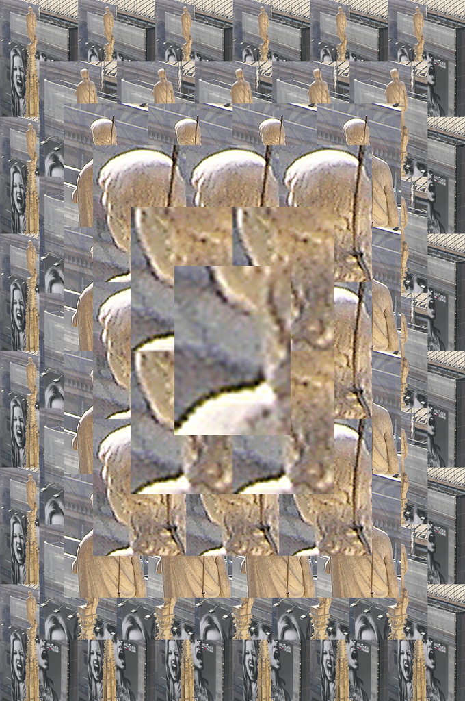 Van dezelfde foto wordt een fragment steeds verder uitvergroot. Hierdoor wordt het niet duidelijker maar juist minder duidelijk. Bovendien overlappen de fragmenten elkaar, zodat je alleen een beeld van de oorspronkelijke foto kunt krijgen door de fragmenten a.h.w. "op te tellen". Te koop in allerlei formaten. foto 2011-2