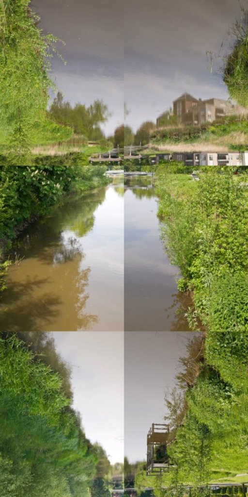 Vanaf 3 brugen die over een recht stuk Dommel liggen heb ik de oevers en de weerspiegeling gefotografeerd. De fotocollage is een "reconstructie van wat er in werkelijkheid te zien is. Te koop in diverse formaten