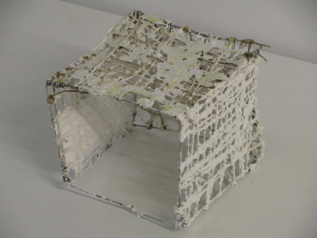 De kubus is gemaakt van ijzerdraad, touw en gips en is heel transparant gehouden.