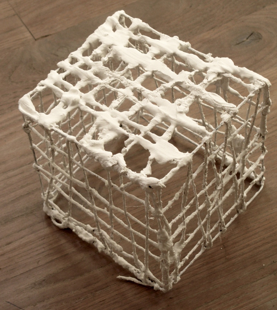 Draadkubus van ijzerdraad, touw en gips. Transparant