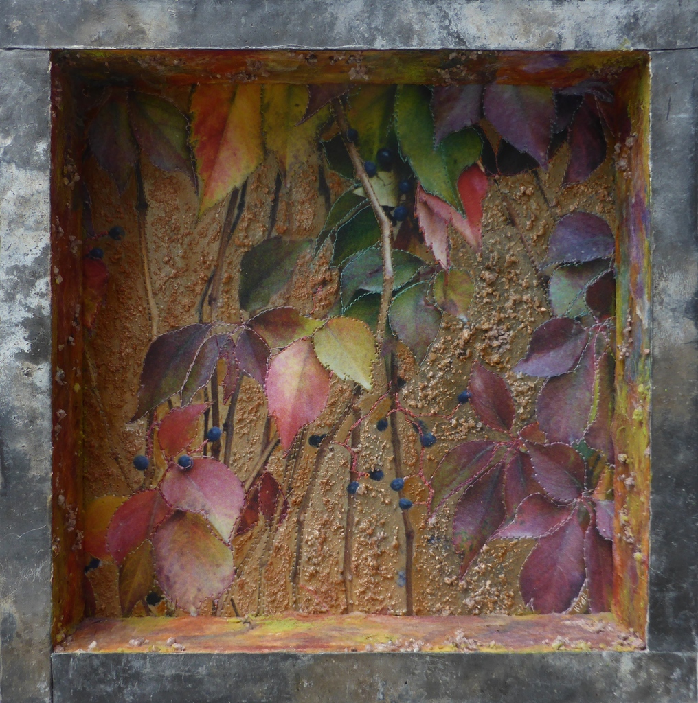 Kijkdoos met detailfoto van een Wilde wingerd op een muur, gecombineerd met zand en papier. Loden buitenrand en zilveroxides, en papieren binnenrand