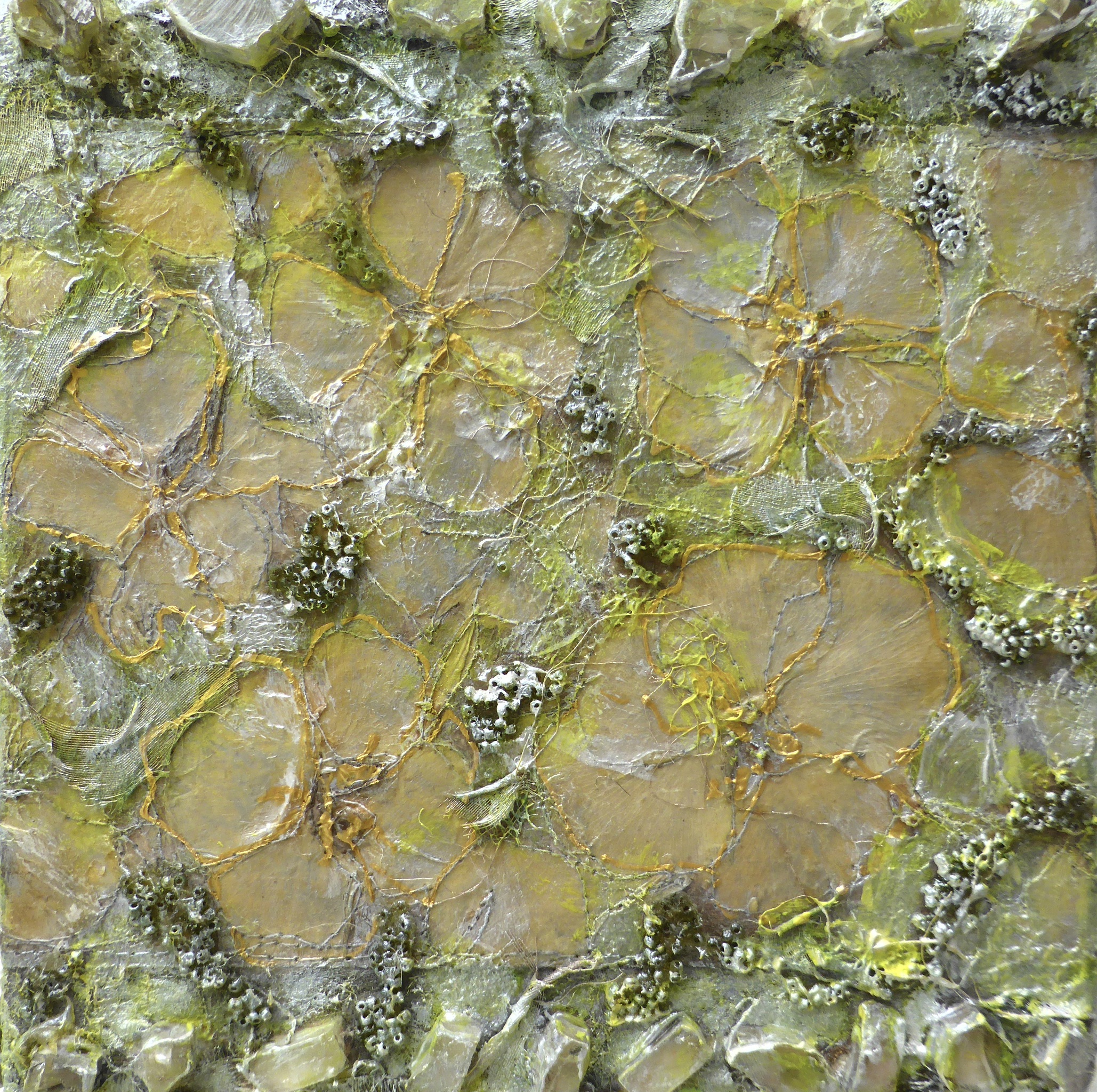 Natuurassemblage van rozenblaadjes uit de tuin op papier met stikwerk, kraaltjes, metallic verf en glasscherven. Op 4 cm diep canvas.