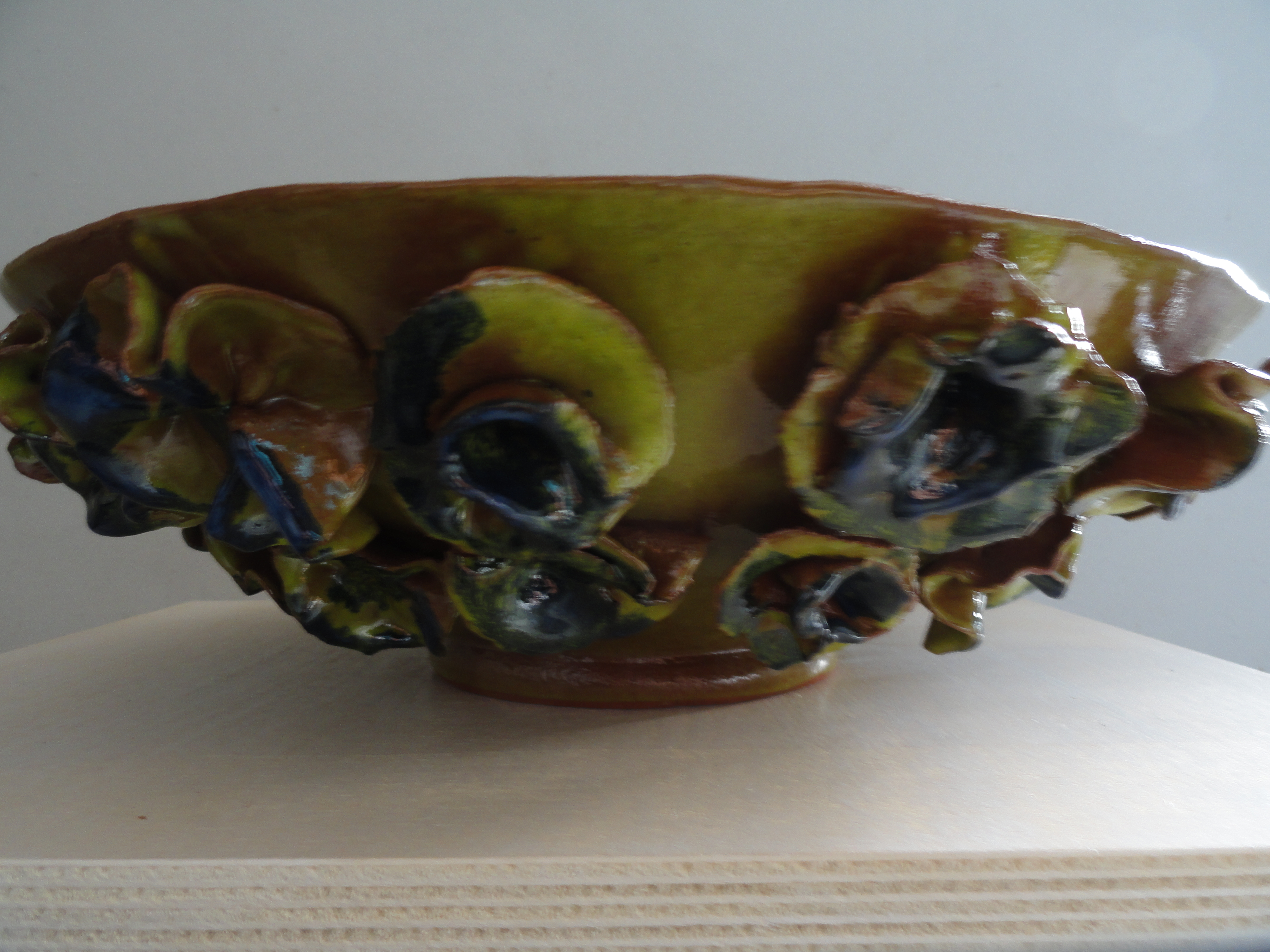 Handgevormde schaal uit rode klei. Aan de buitenkant bezet met kleine roosjes. Geglazuurd met gele aardewerkglazuur waarbij binnenkant bestrooid is met kobalt korreltjes wat een eigentijds effect sorteert. De roosjes aan de buitenkant zijn deels geglazuurd met blauw glazuur. Gestookt op 1060 graden.