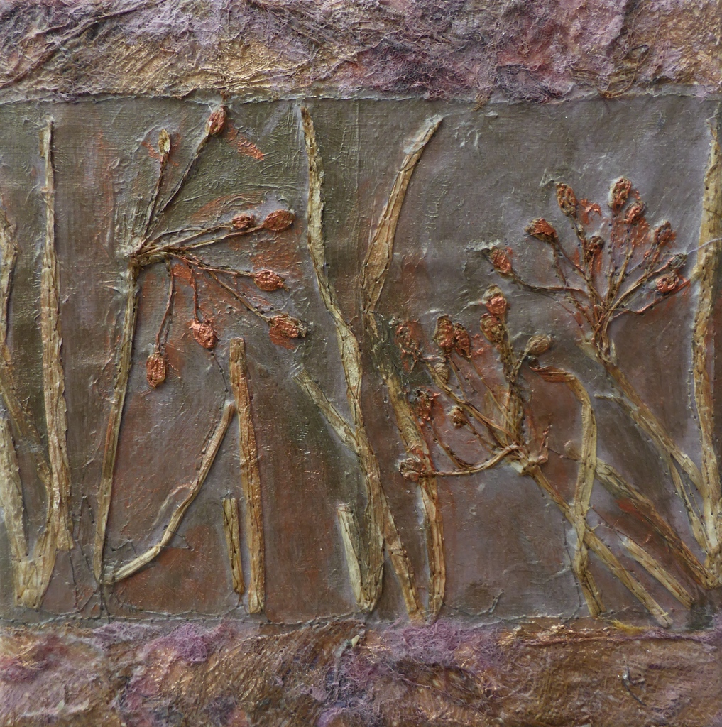 Ik ben een materialen mens, en maak samenvoegingen van verschillende materialen; foto’s, stoffen en borduursels, soms ook gecombineerd met hout, lood en steen, op wisselende formaten