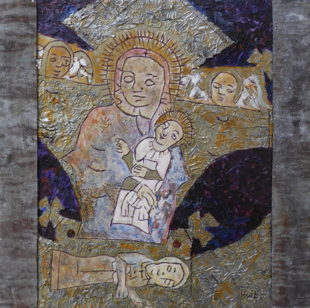 Maria met kind afgebeeld op een Ethiopisch kruis. Engelen kijken mee. Fotografie, stikwerk. Gecombineerd met stoffen en lood van flessen. Loden rand.