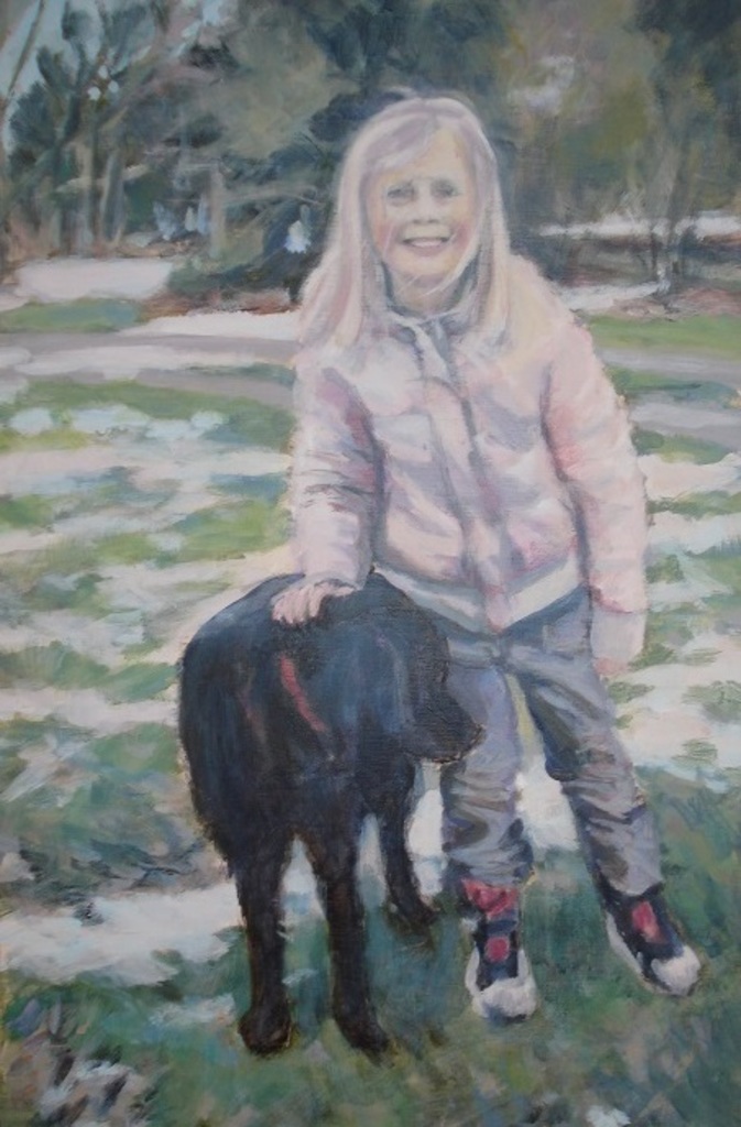 Tijdens een winterwandeling kwamen we deze lieve hond tegen, die even kennis kwam maken. Gauw wat foto's gemaakt en later zag ik er wel een mooie compositie in voor een schilderij.