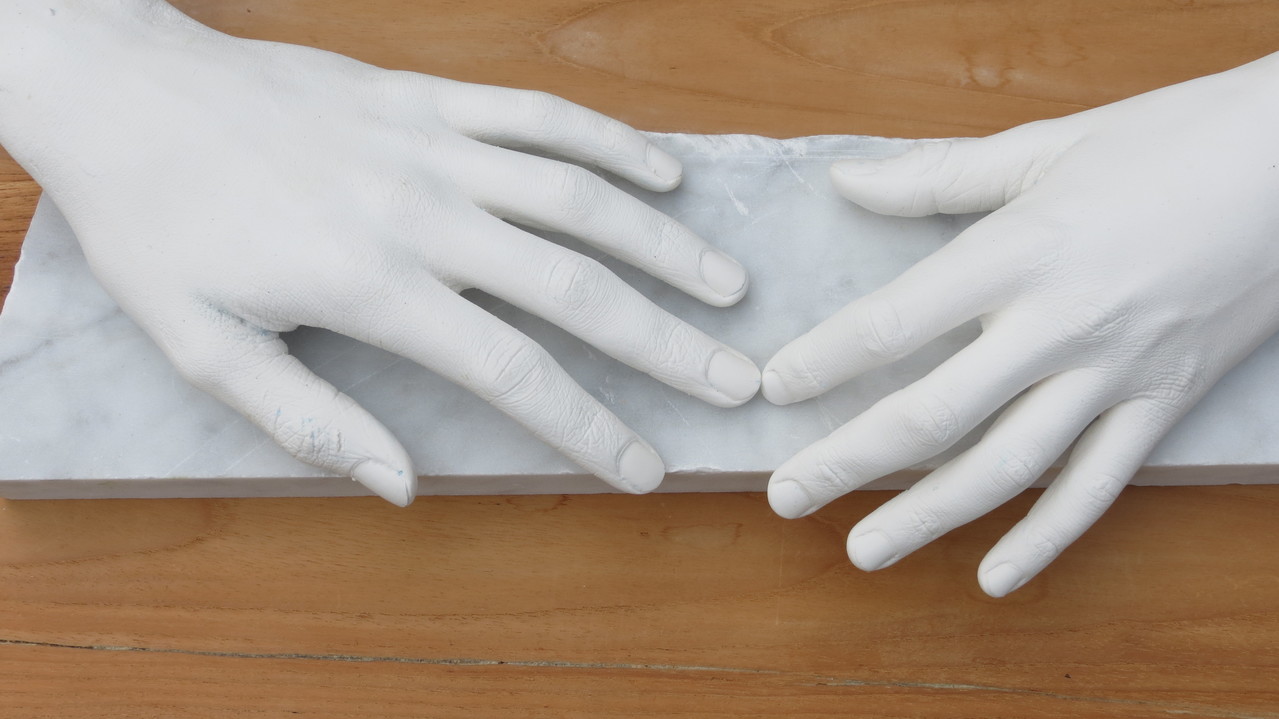 De handen van de broers Arvid en Tycho afgegoten in ´marblecast´gips. Respectievelijk 15 en 14 jaar oud.