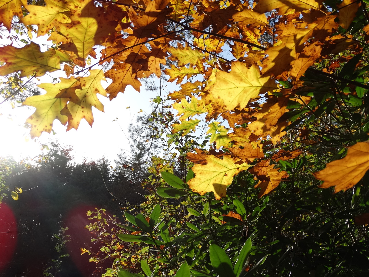 Schitterend, deze bruine en gele eikenbladeren met het groen eronder.