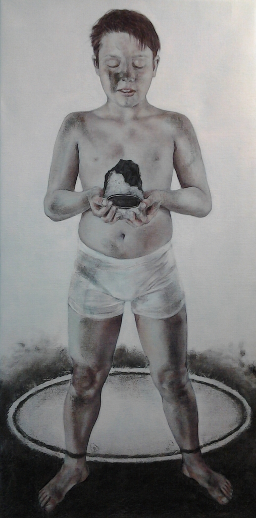 Het mijnverleden is ook zijn verleden, net zoals de sluiting van een gekend automobiel bedrijf in Limburg. Een deel van het gekende bedrijfslogo vind je terug in de steenkool en de keten aan zijn benen.