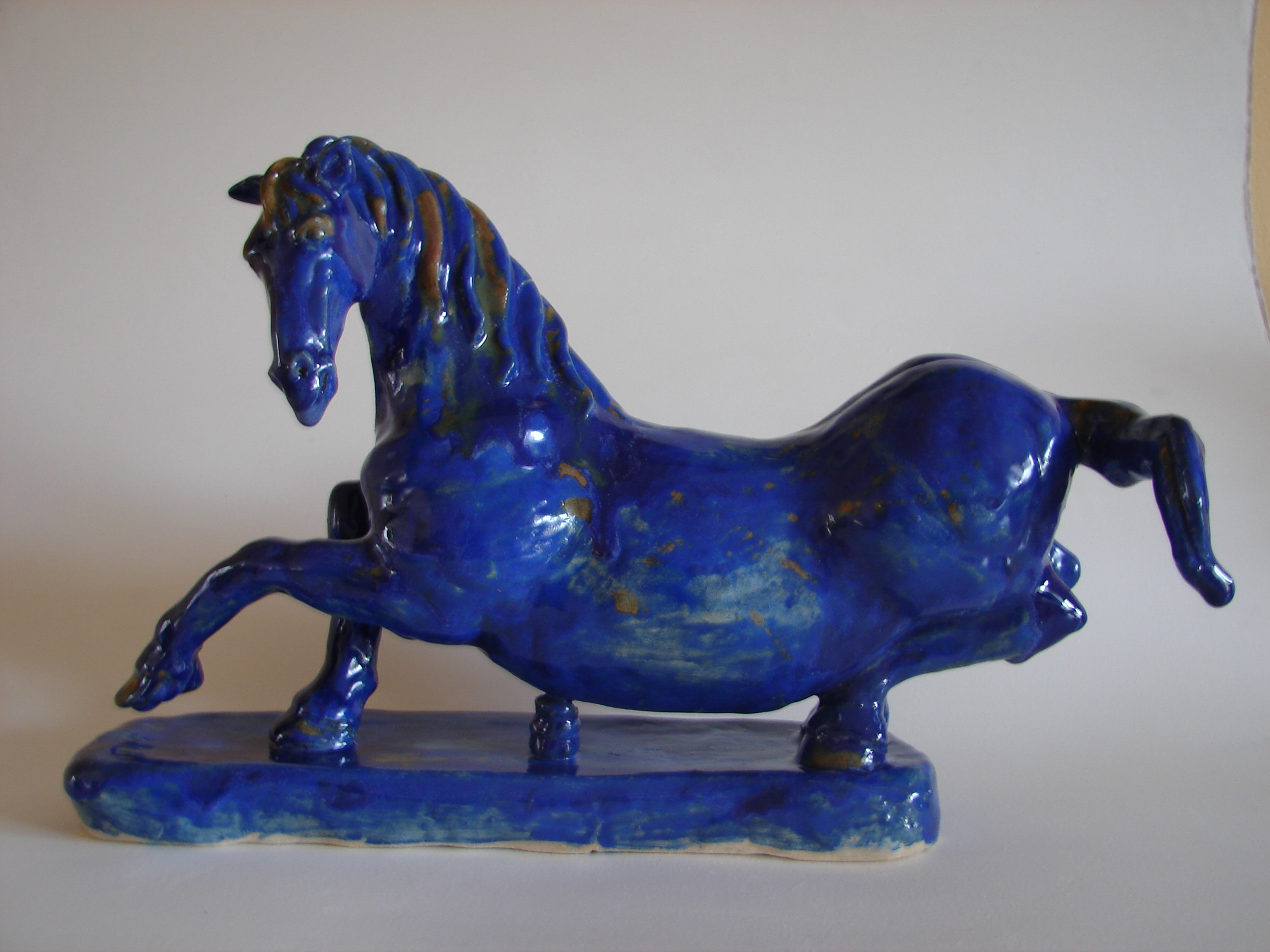 Blauw paard op 3 benen op een podiumpje, terracotta met blauw glazuur en rutielspetters