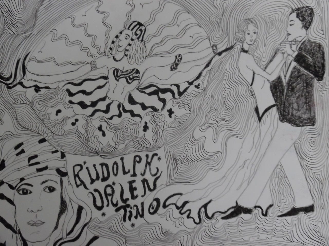 een zwart en wit tekening met pen een dansende rudolf valentino
