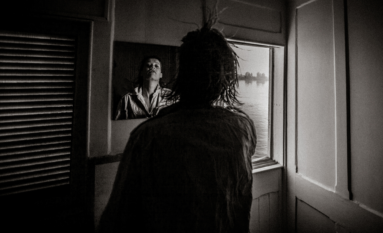 Vrouw kijkt in spiegel op boot in de Nijl