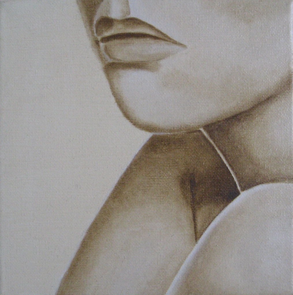 Hoofd, hals en schouders, waarbij het hoofd naar links kijkt. Vormt een tweeluik met het hoofd kijkend naar rechts.