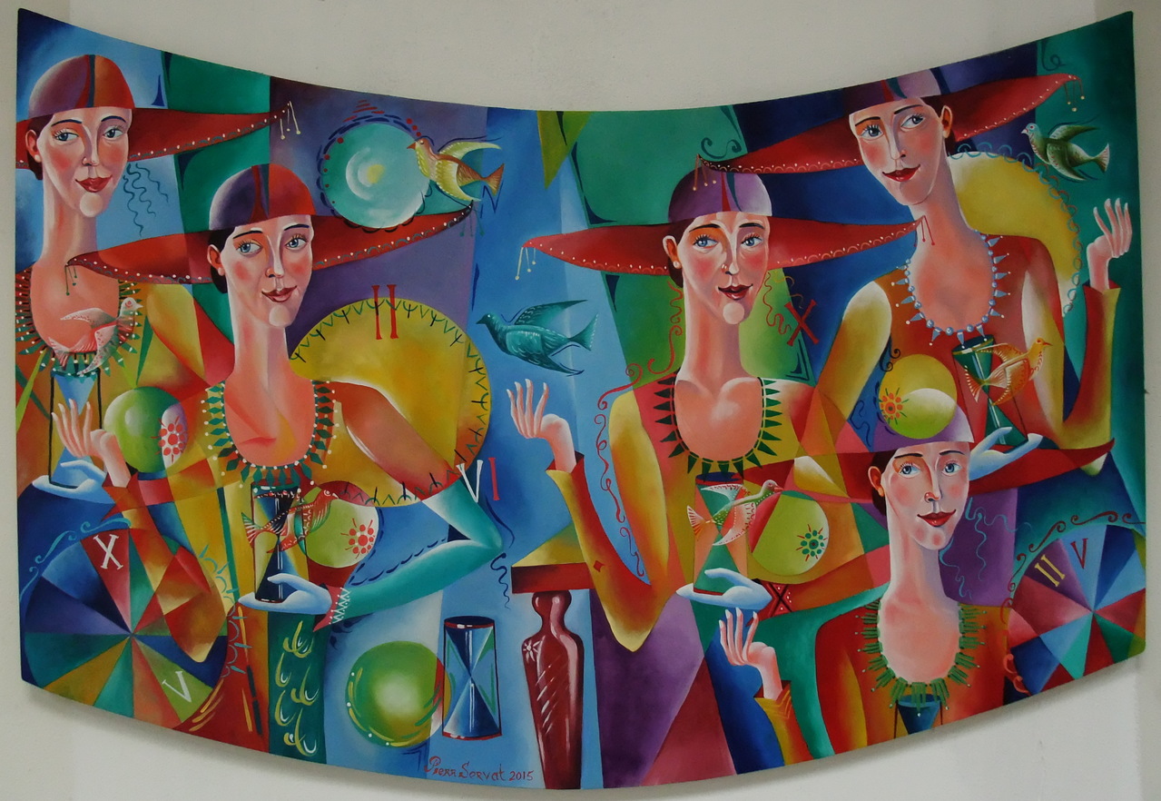 Mooie schone vrouwen houden een zandloper in hun handen, ten teken dat de tijd verglijdt. Hun schoonheid straalt de toeschouwer tegemoet. Vogels kiezen het luchtruim.