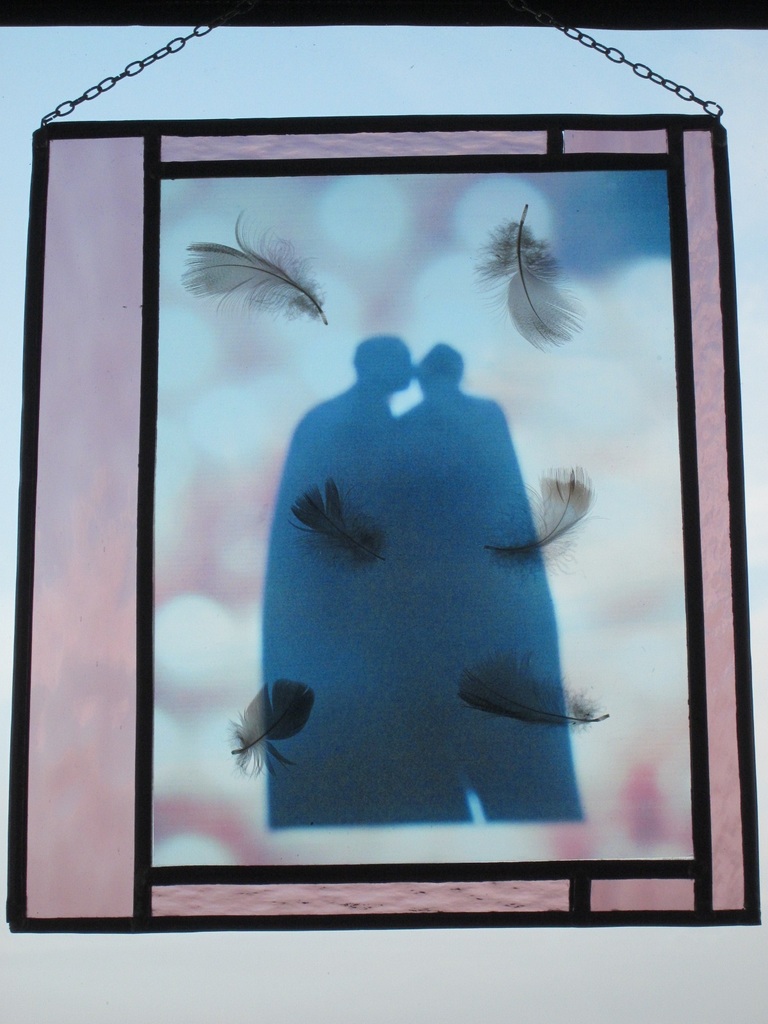 Een bewerkt fotosylhouet van twee menselijke figuren, samen met veertjes tussen 2 lagen dun glas, in lood gevat met een asymmetrische omhulling van bijkleurwnd glas.