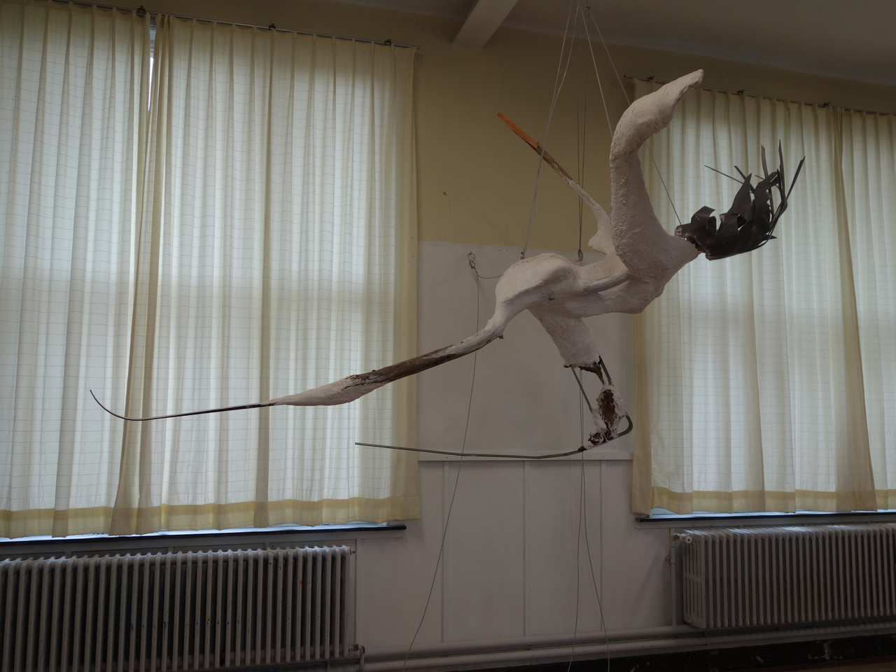 Dit is een vliegend mensfiguur, samengesteld uit verschillende materialen. Het is opgehangen aan stalen kabels.