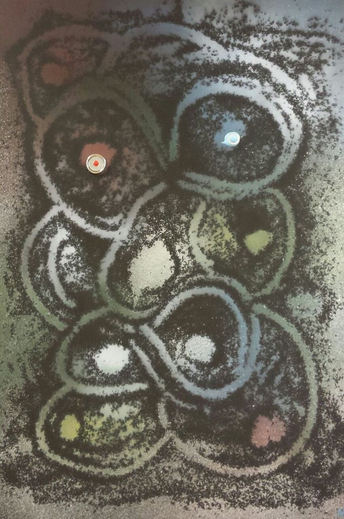 Gebruik gemaakt van verschillende materialen. Rijstkorrels als sjabloon gebruikt. Schilderij is inclusief zwarte baklijst.