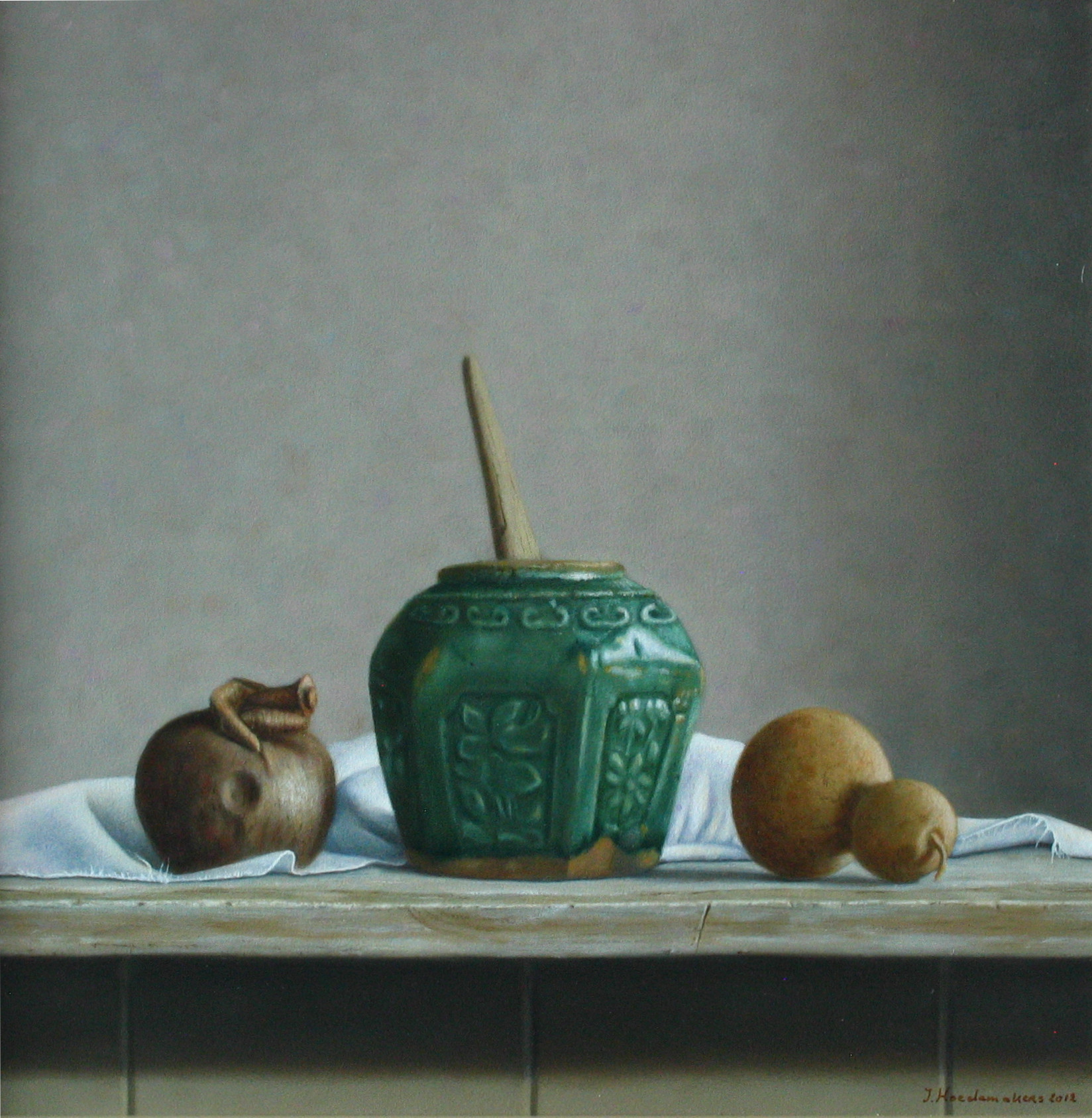 Het stilleven wordt gevormd door het gemberpotje met de 2 harde vruchten. De witte doek bindt de voorwerpen tot een harmonieus geheel.