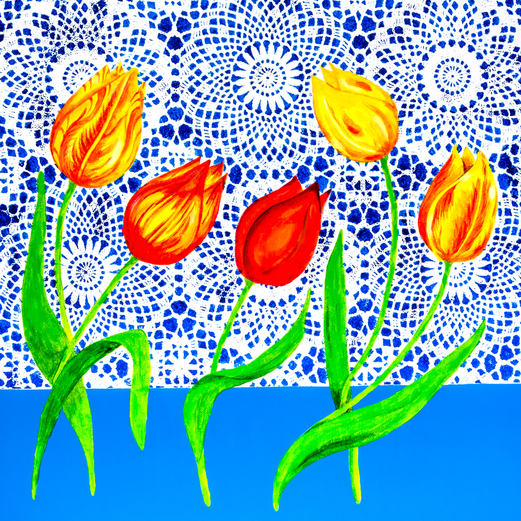 Schilderij Rood Geel Blauw Acryl Tulp Tulpen Bloemen Canvas Bloem Kant Hollands
