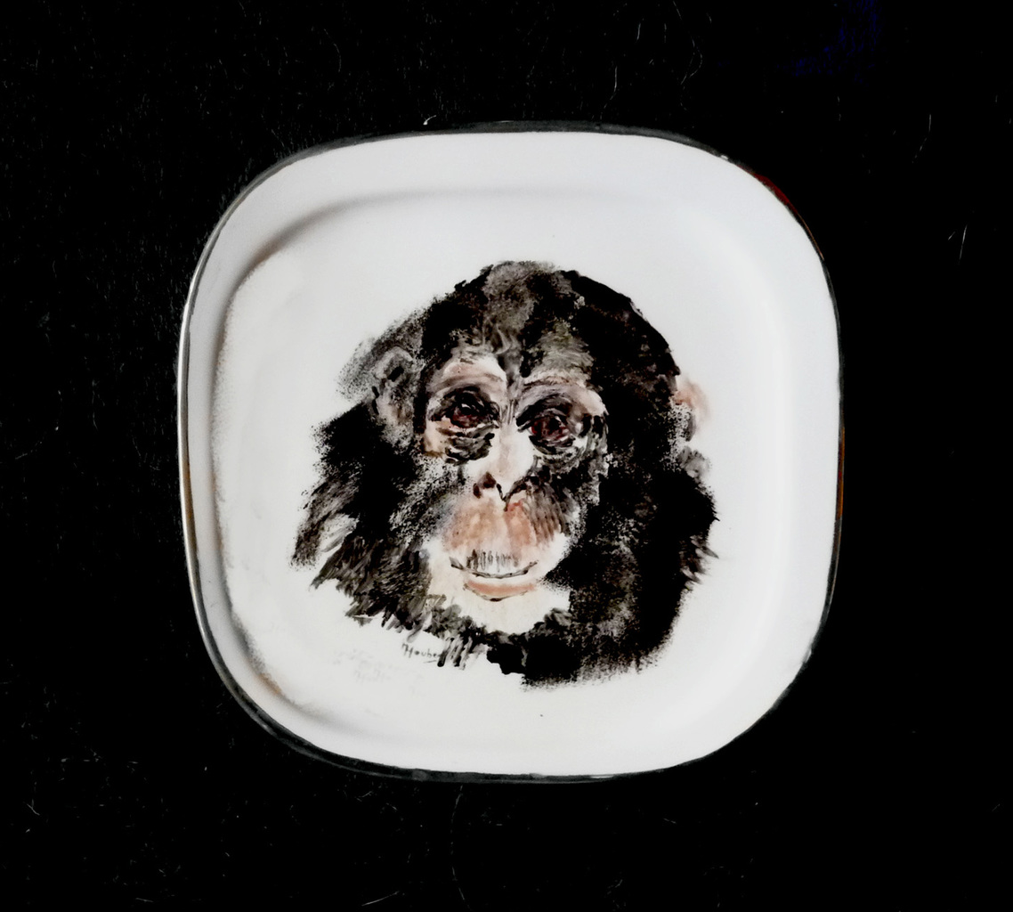 een apengezicht op porselein geschilderd.