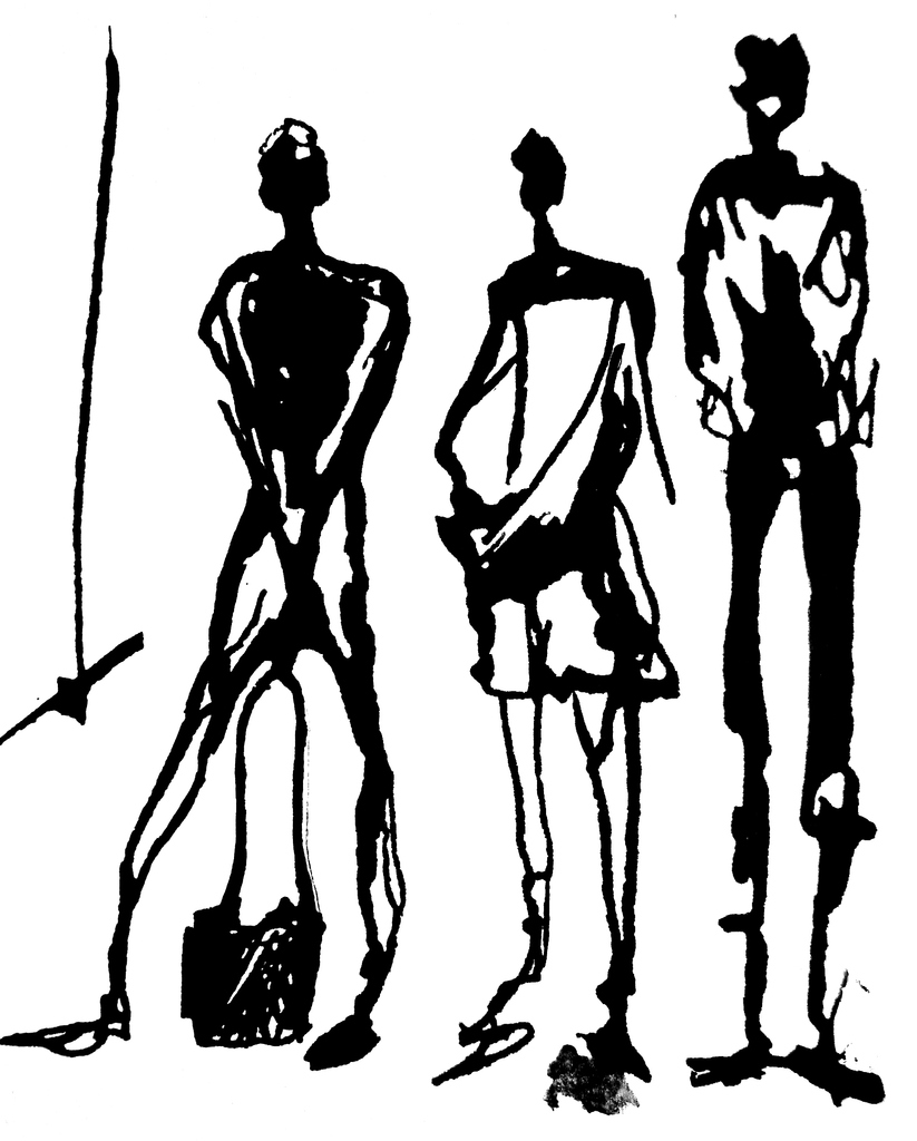 Passanten op een station, rietpen en inkt