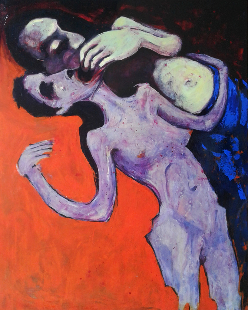 As mentioned in the description of the painting 'Minotaur', a fascination with the Romantics always held a keen interest with me. Especially its notion of the 'Sublime' with its unsettling power. This painting is called 'Lovers (XL)'. We see two figures engaged in a intimate situation. One seems to be more submissive, while the other touches the inside of her mouth she holds on to him/her. The whole scene seems to represent the intimate process where love, deep emotions, pain and suffering, and not to forget, complete trust, transforms both lovers and leads them to higher stages of personal growth where they find themselves fully awakened by the process of being reborn.