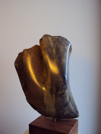 THEA SABELIS (1945)geboren te'sGravenhage .Mijn beelden zijn abstract ,de harde steen die ik bewerk tot een aaibaar lap stof.