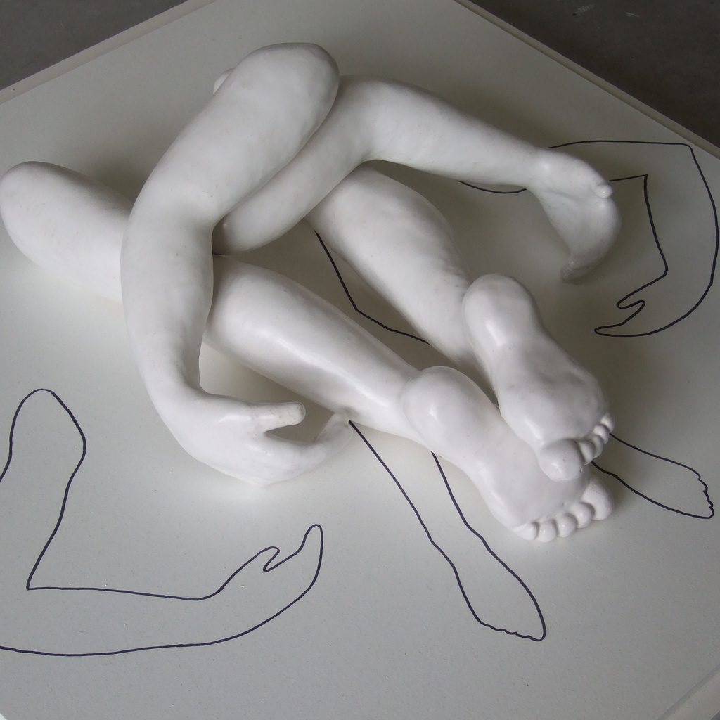 Benen (om) Armen Jaar: 2015 Materiaal: keramiek en tekening op hout Afmetingen: 80 x 80 x 20 cm Prijs: 4.700 euro