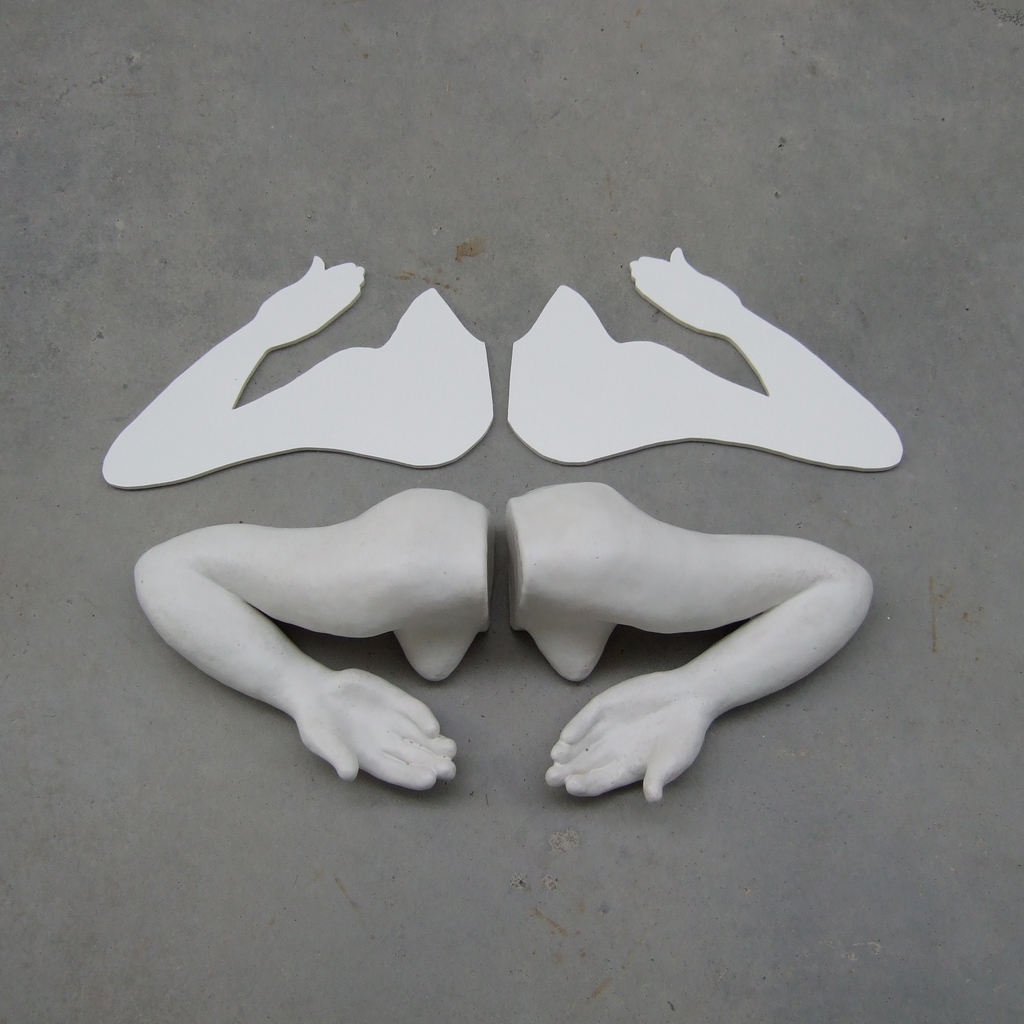 Empty hands Jaar: 2013 Materiaal: keramiek en hout Afmetingen: 80 x 60 x 15 cm.