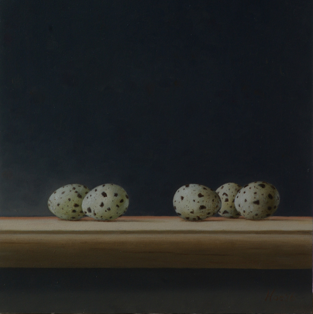 Het stilleven wordt gevormd door een zorgvuldige compositie van de kwarteleitjes en de lichtval.