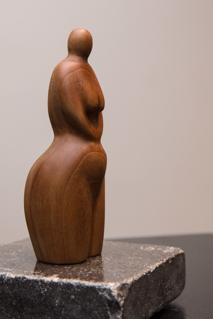 "Oermoeder" (12x5x4cm) - december 2007. Kerselaar op getrommelde blauwe steen. Geïnspireerd op Venus van Willendorf, vruchtbaarheidssymbool. IN PRIVEBEZIT