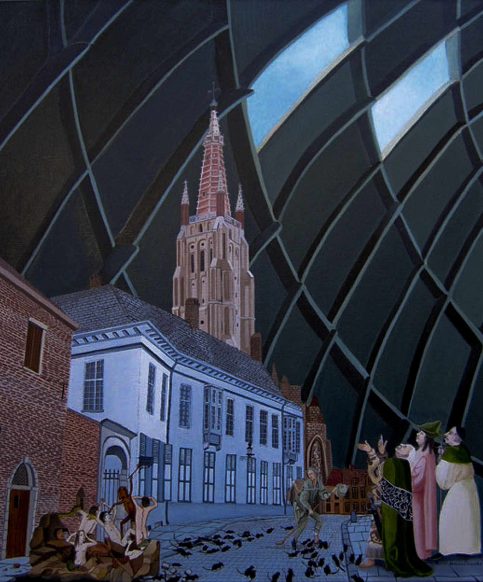 De achtergrond van de O.L.Vrouwekerk te Brugge vormt de achtergrond waartegen de eerste voortekens van de apocalyps zich aftekenen. De hemel is herleid tot een koepel met een spaarzame opening naar de hemel. De kerk krijgt iets van een raket en enkele profeten staren vol weerzin naar de hemel. De ratten verlaten de stad en een solitair figuur steekt de straat over. De duivels uit het vagevuur dringen de mens terug naar de hel. Dit belooft weinig goeds.