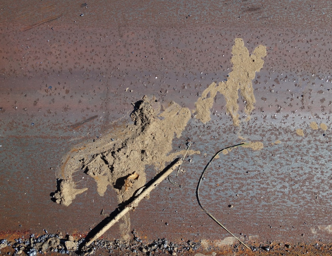 Als gedachten de werkelijkheid najagen / kun je beter in verborgenheid / de jager voorbij laten gaan. Mixed media: klei met stok en stengel op geroest metaal. (afmeting 90x60 cm)