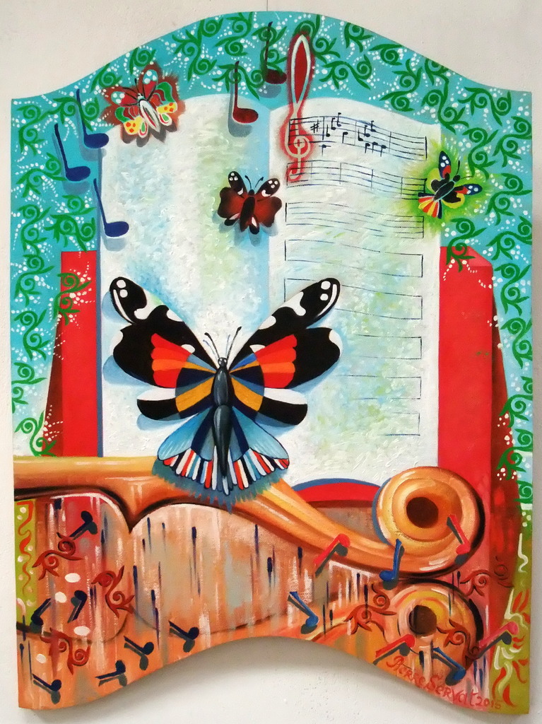 Voor dit schilderij heb ik een aparte vorm uitgezaagd en beplakt met linnen. Het is geschilderd met olieverf. Het thema muziek spreekt mij zeer aan. Ik heb vrijwel mijn hele leven in koren gezongen en in mijn vrije tijd speel ik key board. Muziek maakt je blij! Muziek kan je ontroeren en je stem is een prachtig instrument.