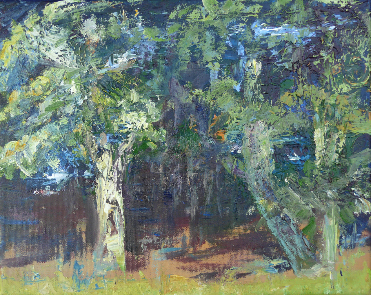Geïnspireerd door de zon op de bosrand en de lichtval tussen de bomen, ontstond dit schilderijtje.