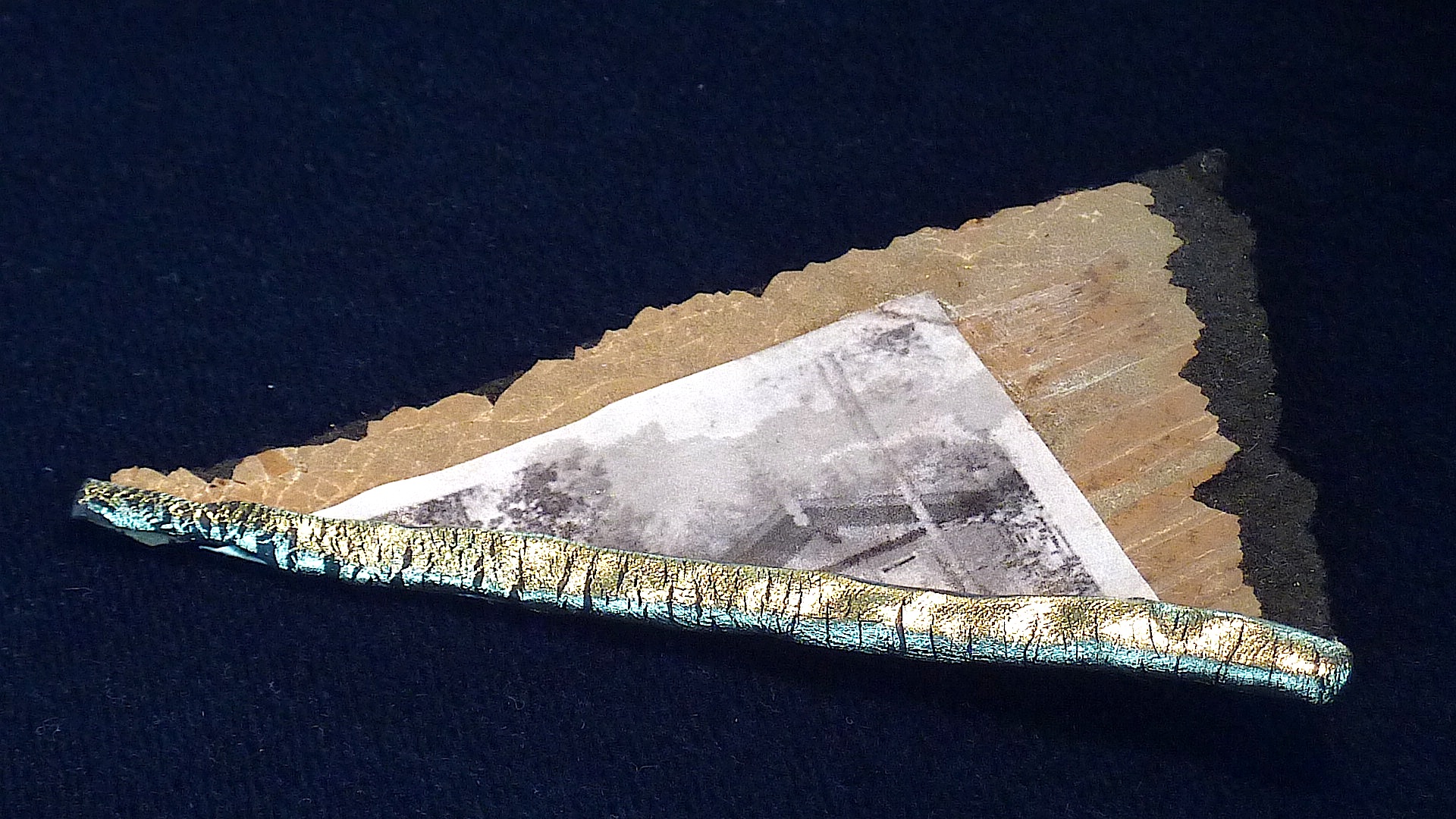 De broche 'Kiekje' is gemaakt van een stukje linoleum uit de Boshut. Er is een foto van de Boshut verwerkt. Deze foto is een kopie van een oude foto die Anne Pillen in de Boshut heeft gevonden. De foto loopt door op de achterzijde van de broche. Bij het maken van de Boshut collectie ben ik uitgegaan van drie elementen die voor mij de Boshut symboliseren: teksten (van Sonja Prins), natuur en kunststof (omdat Sonja Prins alles repareerde met plastic materiaal).