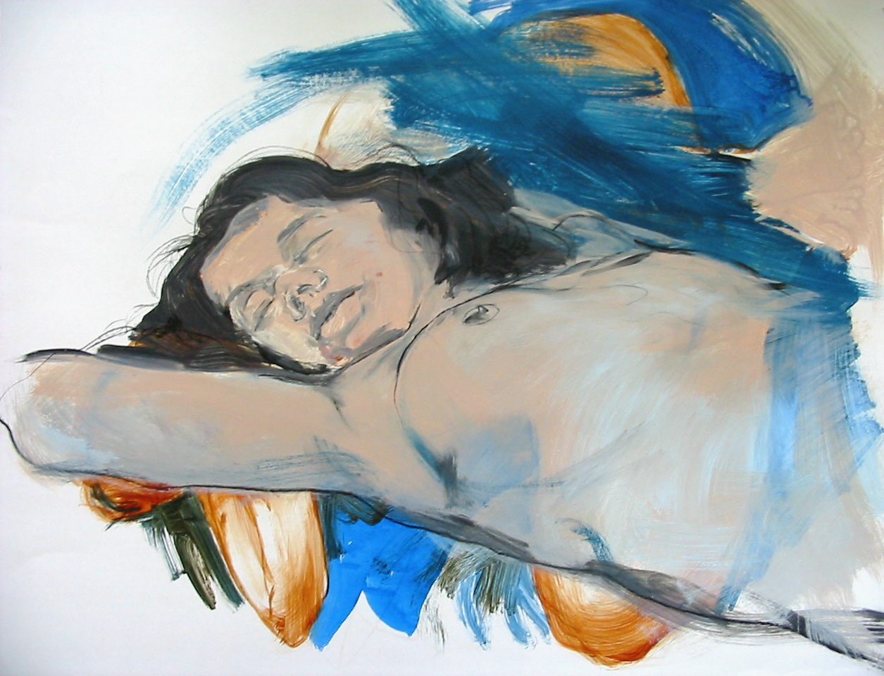 vlot opgezette modelschets, naakt, in acryl en krijt incl. houten wissellijst