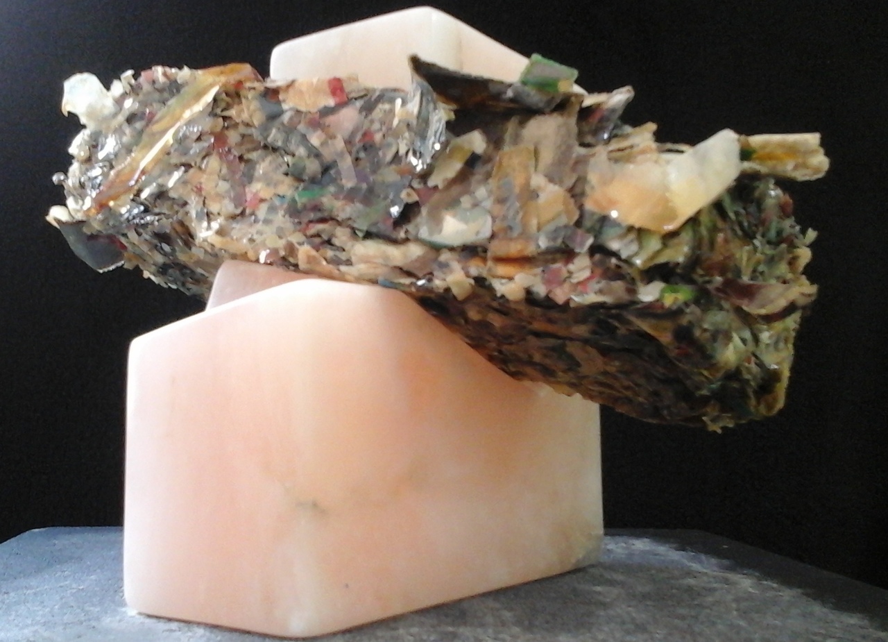 Woordvanger is gemaakt van roze albast en papier. Het papier is geperst en daarna gelakt.