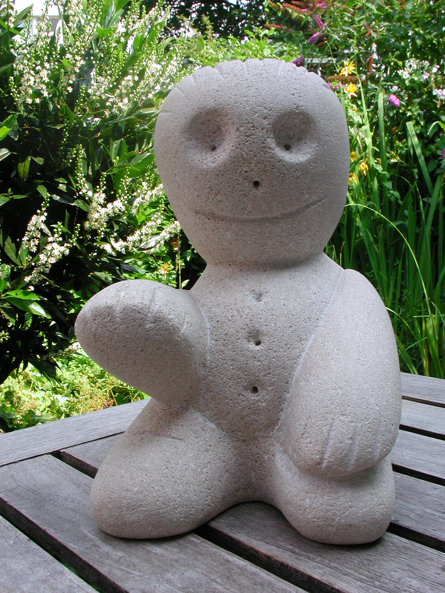 Figuur gemaakt van kalksteen naar een voorbeeld van een kleipoppetje van een kind.