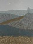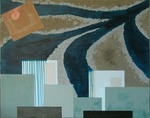 Abstract rivierenlandschap, op de voorgrond een stad