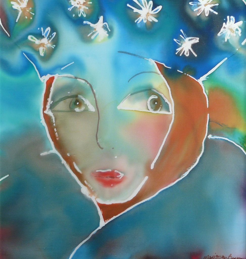 Portret abstraherend op zijde geschilderd met de kwast waarbij gebruik gemaakt is van gutta, vloeiende zijdeverf en opaque zijdeverf.