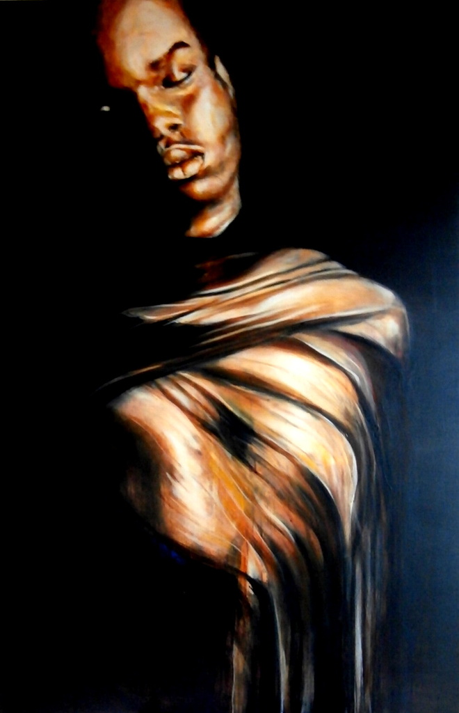 Auxelle JM Lauhouh , schildering naar foto, mannelijk model www.galeriebernheze.nl Als mens staande met beide voeten in en op deze aarde, ben je overgegeven aan het lot des leven.