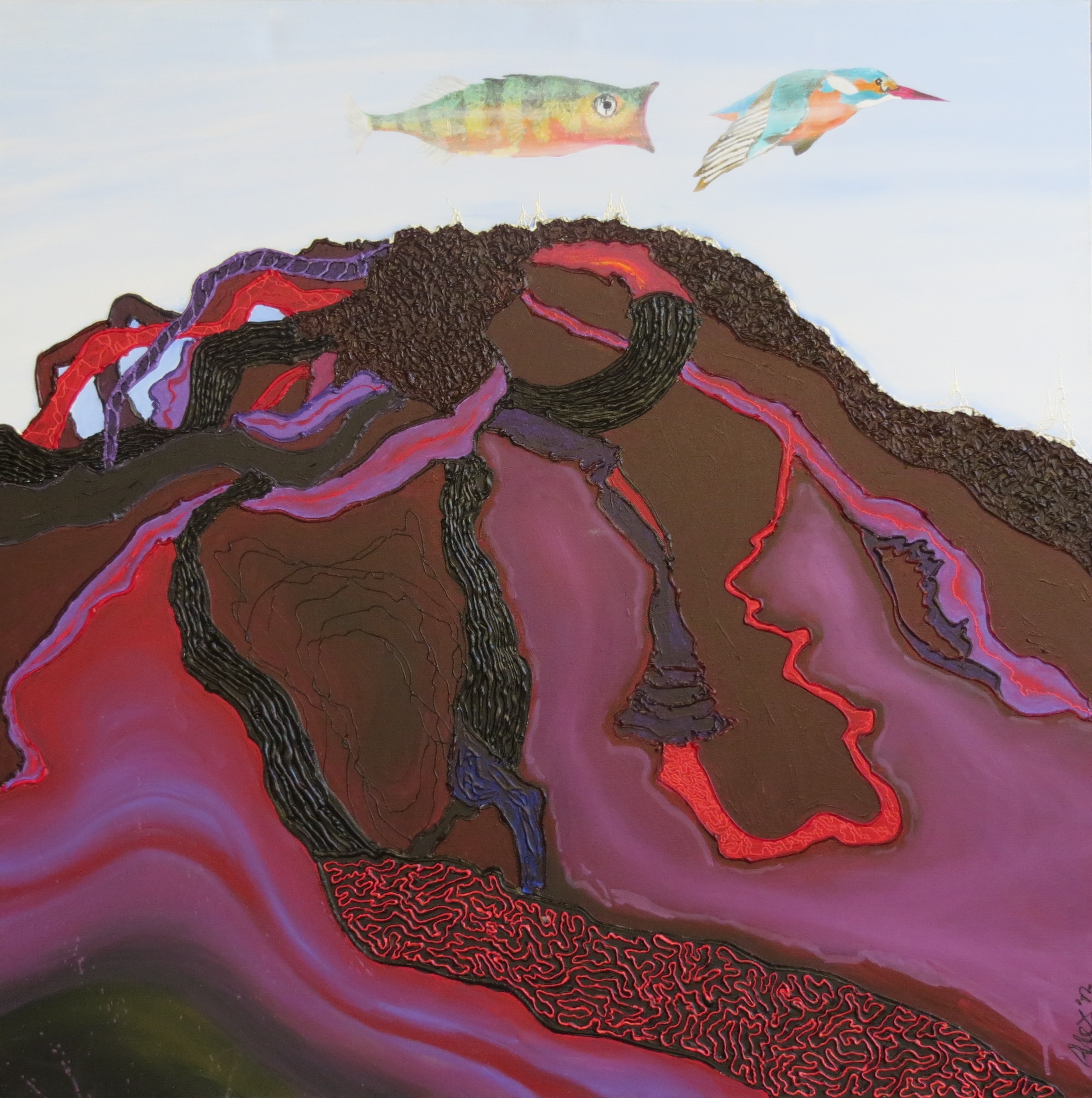 Struinend langs de Maas zag ik hoe de Maas de wortels van een boom gezelde. Toen vervolgens een ijsvogel voorbij flitste had ik genoeg stof voor dit werk.