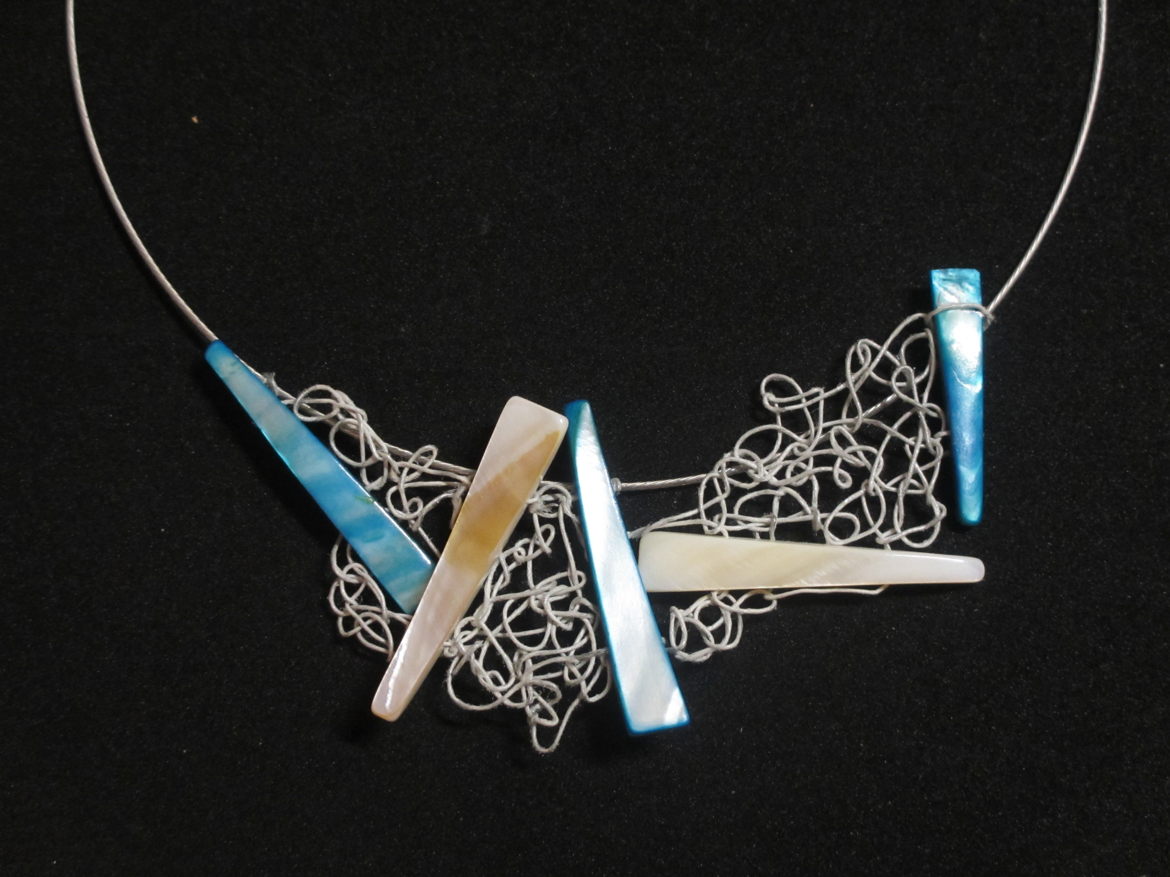 langwerpige schelpelementen zijn aan elkaar 'gebreid' aan een spang van 14 cm doorsnee. Deze is verkocht maar er kan een variant gemaakt worden op aanvraag