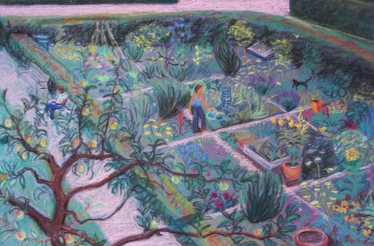 Een appelboom laat zijn appels mooie rijp worden in de zon. Veel bloemen bloeien en tomaten geven hun vrucht.Een vrouw geeft water aan haar planten.