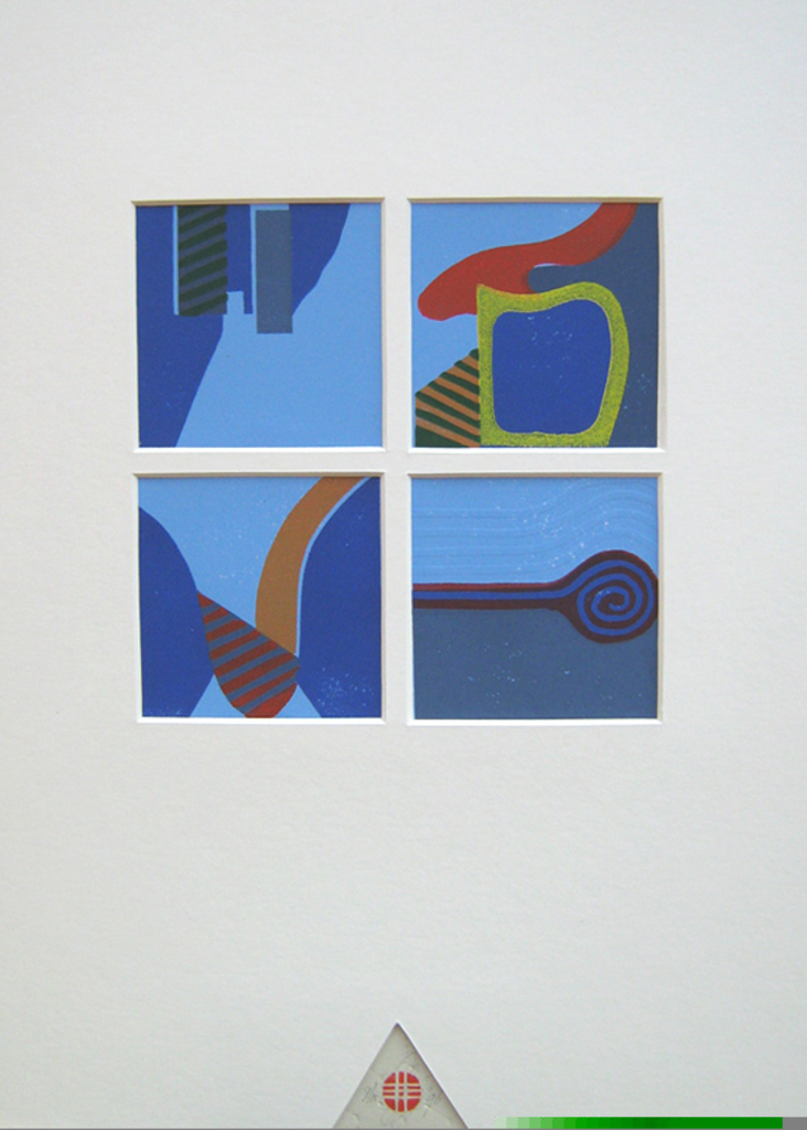 Linoleumsnede met preeg / oplage 15 / eigen druk Geometrische&organische vormen verdeeld in 4 vakjes (daar zijn ze weer) Prijs is zonder lijst!