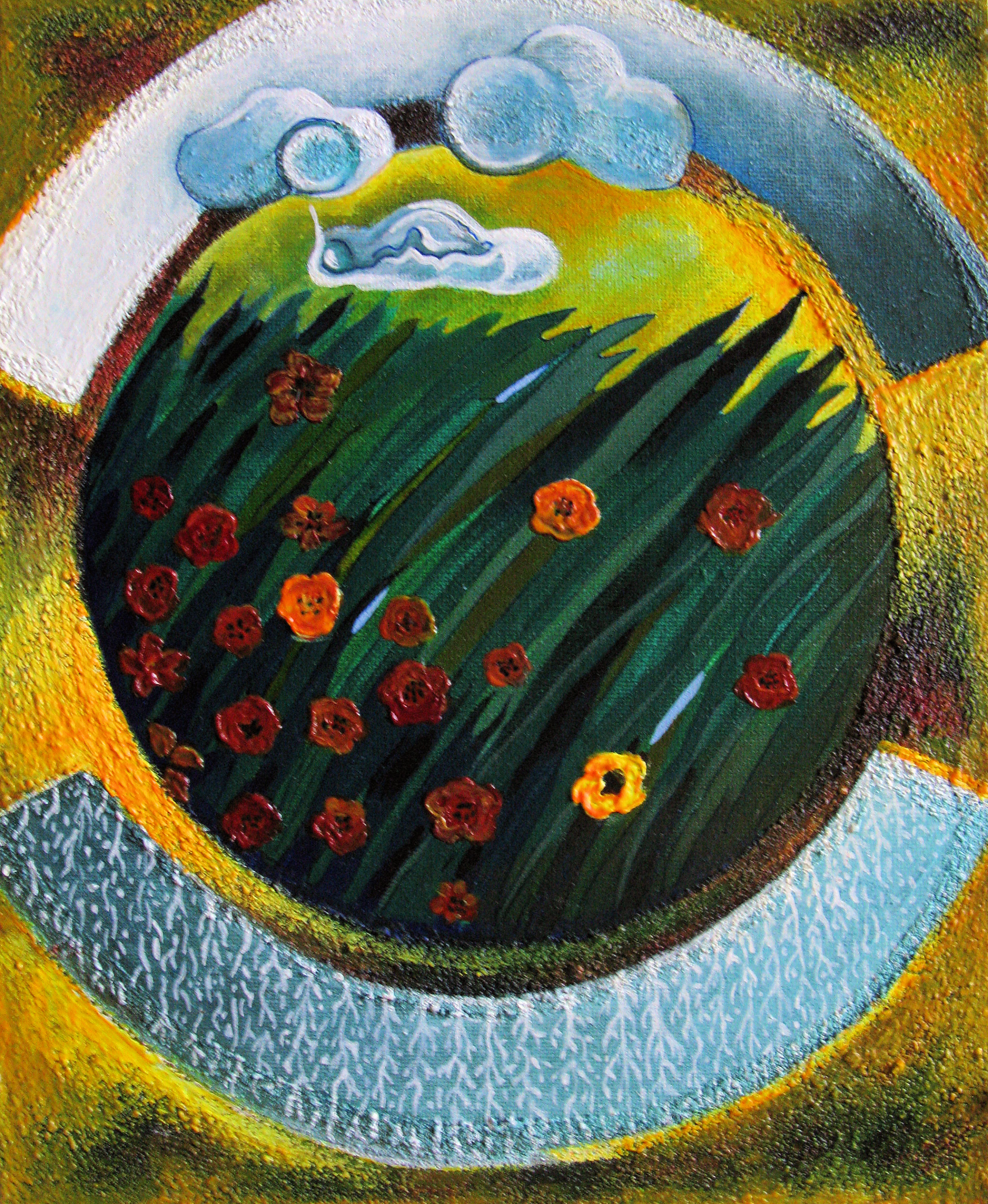 Bloemen als knopen, vlijmscherp grashalmen,fragile wortels, zonlicht, wolken.