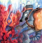Vertaling, van een keramiek tegel met een interessant vlekkenpatroon, naar een tekening in kleurpotlood.